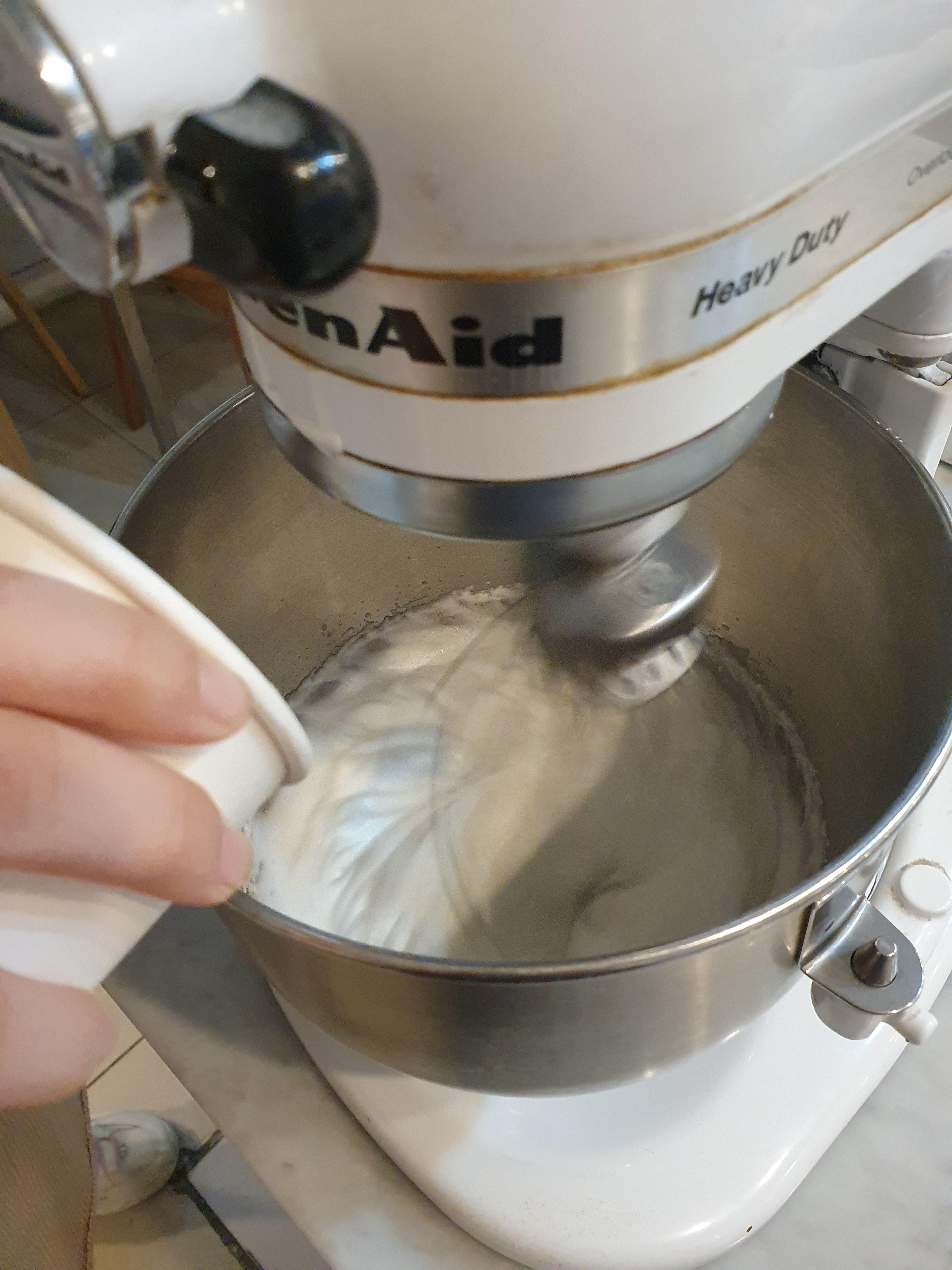 주의사항을 충분히 알았으니, 흰자가 거품이 충분히 일어나 어느정도 하얀색을 띌 때(그렇다고 100% 휘핑은 아니고요!) 설탕을 3번에 걸쳐 나눠서 넣어주시면 됩니다.(kitchen aid 휘핑기 기준 속도 6으로)