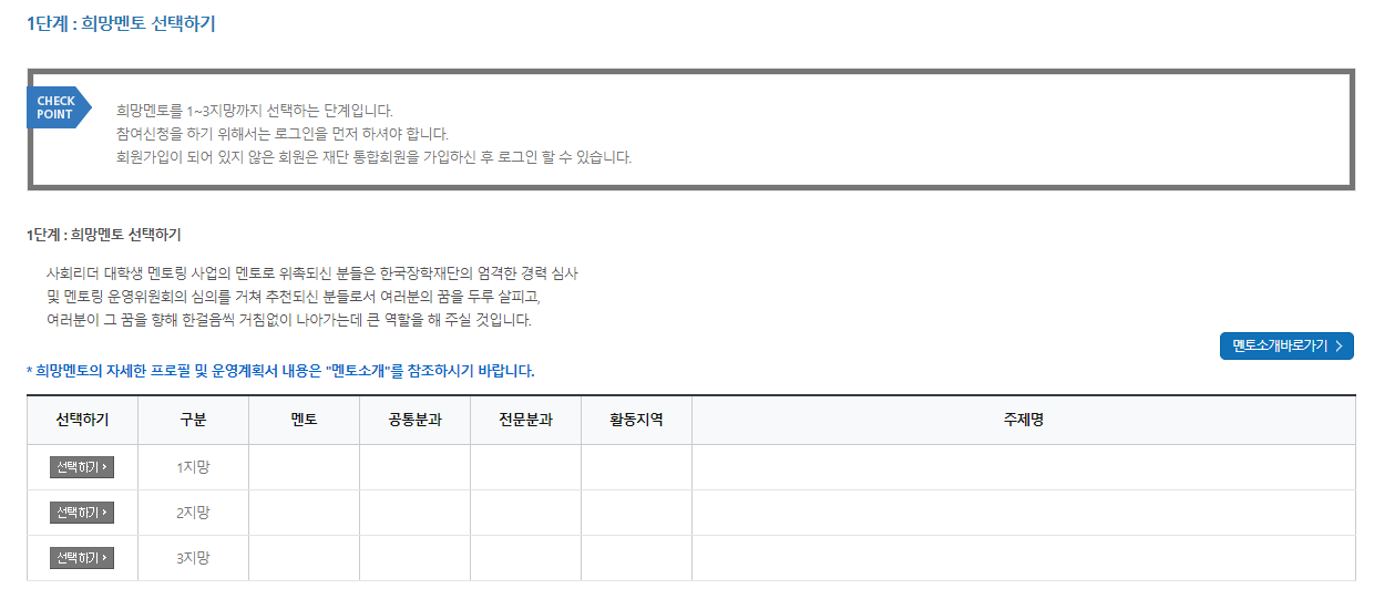 멘토의 경우, 멘토 찾기 메뉴에 가면 멘토님의 경력사항(어느 기업 소속)이 적혀있고, 멘토링 계획서가 업로드되어 있습니다. 그걸 토대로 3순위까지 정하시면 돼요.