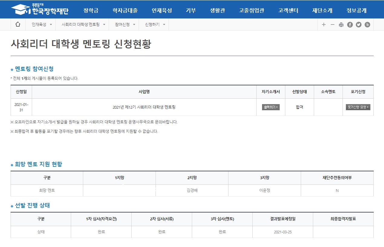지금도 한국장학재단 홈페이지→맨 위 메뉴 중 인재 육성→ 사회리더 대학생멘토링→ 멘토소개 코너로 가시면 볼 수 있습니다.