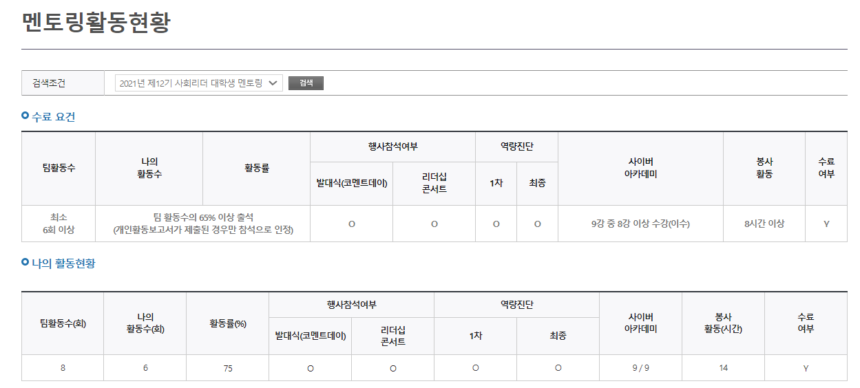 만약 활동 시수를 못채우거나 중도포기 시 재선정될 때 불이익이 있을 수 있으니 한번에 수료하시는 게 좋아요!