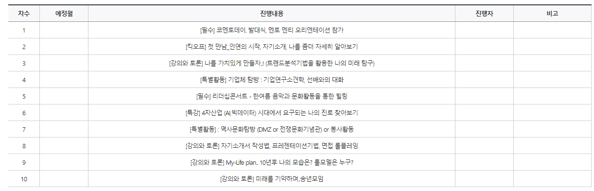 매월 진행했던 멘토링 내용을 간략히 리뷰하자면, 위 활동계획서에서 보다시피 취업에 관련된 활동이 많았습니다. 면접방법, 자소서쓸 때 고려해야할 점 같은 거요. 주제들이 주로 취업관련인 것은 멘티들이 주로 3,4학년이라는 것도 한몫하는 것 같아요.(저는 2학년때 했는데, 제가 가장 어리더라고요... 다들 취준하실 때 멘토님께 조언을 얻고자 이 프로그램을 신청하시는 것 같아요.)